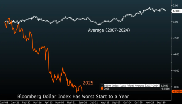 行情数据显示,彭博美元指数今年迄今已下跌了逾8%,创下有记录以来最糟糕的年度开局。ICE美元指数年内的跌幅也达到了约9%,很可能创下至少1986年以来最差的上半年表现。
